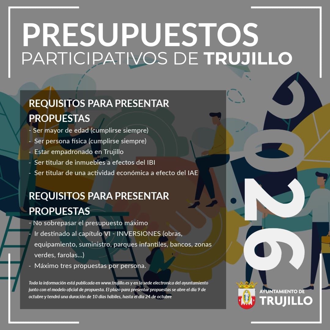 El Ayuntamiento ha abierto el plazo hasta el 24 de octubre para que cualquier persona pueda presentar propuestas de cara a los presupuestos participativos del año 2026. Para ello, entre otros requisitos, hay que ser mayor de edad y estar empadronado en Trujillo. También se tendrá en cuenta ser titular del inmueble a efectos del IBI y ser titular de una actividad económica a efectos del IAE.