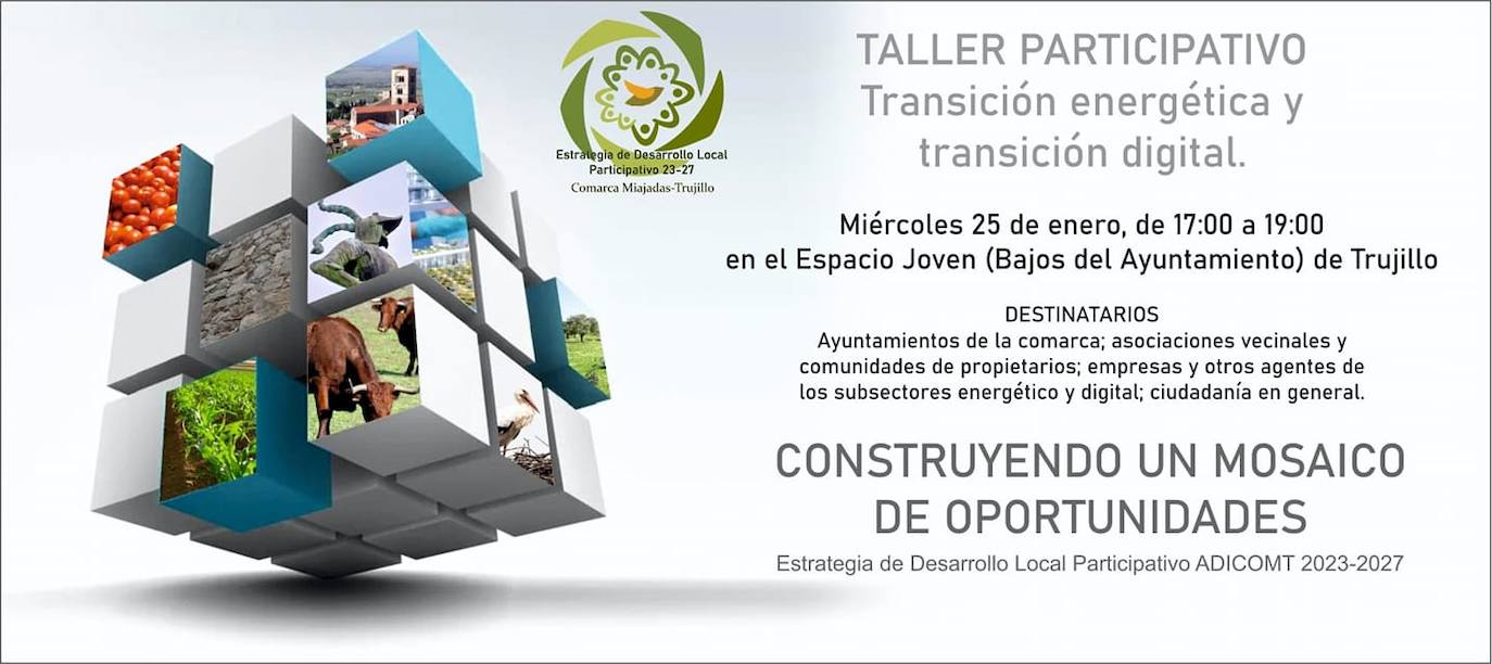 El grupo de acción local continúa con sus acciones para recoger ideas y propuestas para el diseño de la Estrategia de Desarrollo Local Participativa 2023-2027 o, dicho de otro modo, el programa que incluirá inversiones con fondos europeos para ese periodo. Ya, hace unos días, se celebró un taller participativo en Miajadas y este miércoles, 25 de enero, tendrá lugar uno nuevo en Trujillo. Se hablará de la transición energética y digital y está convocada la ciudadanía en general y, sobre todo, representantes de ayuntamientos, colectivos vecinales y comunidades de propietarios de la comarca. También pueden acudir empresarios y agentes vinculados a los subsectores energéticos y digital.
