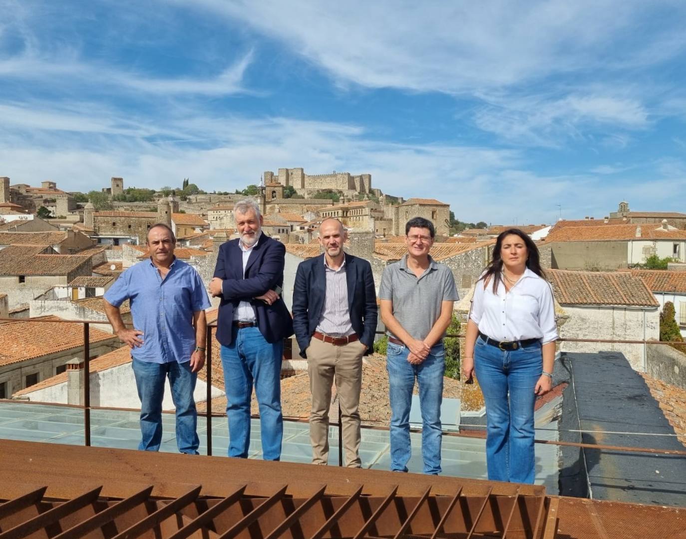 El secretario general de Desarrollo Rural de la Junta, Manuel Mejías, ha hecho una visita al grupo de acción local de la comarca Miajadas-Trujillo, con el objetivo de conocer algunos de los proyectos que se han financiado con cargo a los fondos europeos del programa Leader. Este dirigente regional estuvo acompañado por la presidenta y vicepresidente de Adicomt, Olga Tello y Alfonso Garrido, así como el vicepresidente de Redex, Rosendo Durán, además de la gerente del grupo de acción local, María Victoria Vega, junto a otros responsables técnicos. Entre otros lugares, visitaron el palacio de los Barrantes Cervantes.