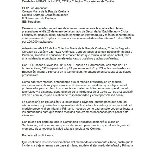 En un principio, las representantes de las AMPA, en esta carta, muestran el malestar ante la vuelta a las clases presenciales este lunes del alumnado de Secundaria, Bachillerato y ciclos formativos, dado el alto nivel de incidencia acumulada de covid tanto en la región como en Trujillo. Por ello, se pide que se mantenga la formación a distancia como hasta ahora.