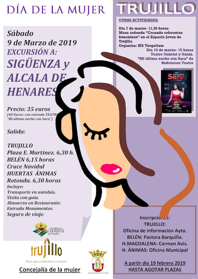 En esta ocasión, se viajará a Sigüenza y Alcalá de Henares el 9 de marzoEl Ayuntamiento de Trujillo ya prepara las actividades con motivo del Día de la Mujer, que tendrá lugar el 8 de marzo. Como en ediciones ... anteriores, habrá una excursión, además de una mesa redonda y teatro.