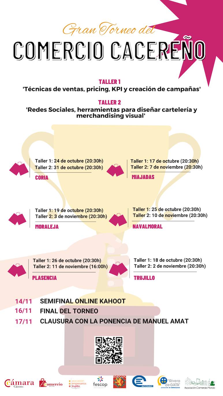 Los talleres formativos se llevarán a cabo en distintas localidades de la provincia. Concretamente, en Trujillo tendrá lugar hoy, a las 20.30 horas y se hablará sobre 'Técnicas de venta, pricing KPI y creación de campañas'. Asimismo, se ha programado un segundo taller sobre el manejo de las 'Redes Sociales, herramientas para diseñar cartelería y merchandising visual', con el objetivo de que el comercio local recurra a estas estrategias comerciales para conseguir más ventas y mejorar la relación con los clientes. Será el 2 de noviembre.