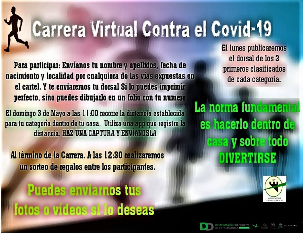 Se trata de una iniciativa del servicio de dinamización deportiva de la Mancomunidad Comarca de TrujilloEl servicio de dinamización deportiva de la Mancomunidad Comarca de Trujillo no ha parado su actividad desde que se decretó el estado de alarma. Gracias ... a las nuevas tecnologías, ha hecho llegar sus propuestas a los diferentes usuarios. Además, está llevando a cabo algunas propuestas especiales. Una de ellas tendrá lugar este domingo. Se trata de 'la carrera virtual contra el COVID-19', prevista para el 3 de mayo, a las once de la mañana.