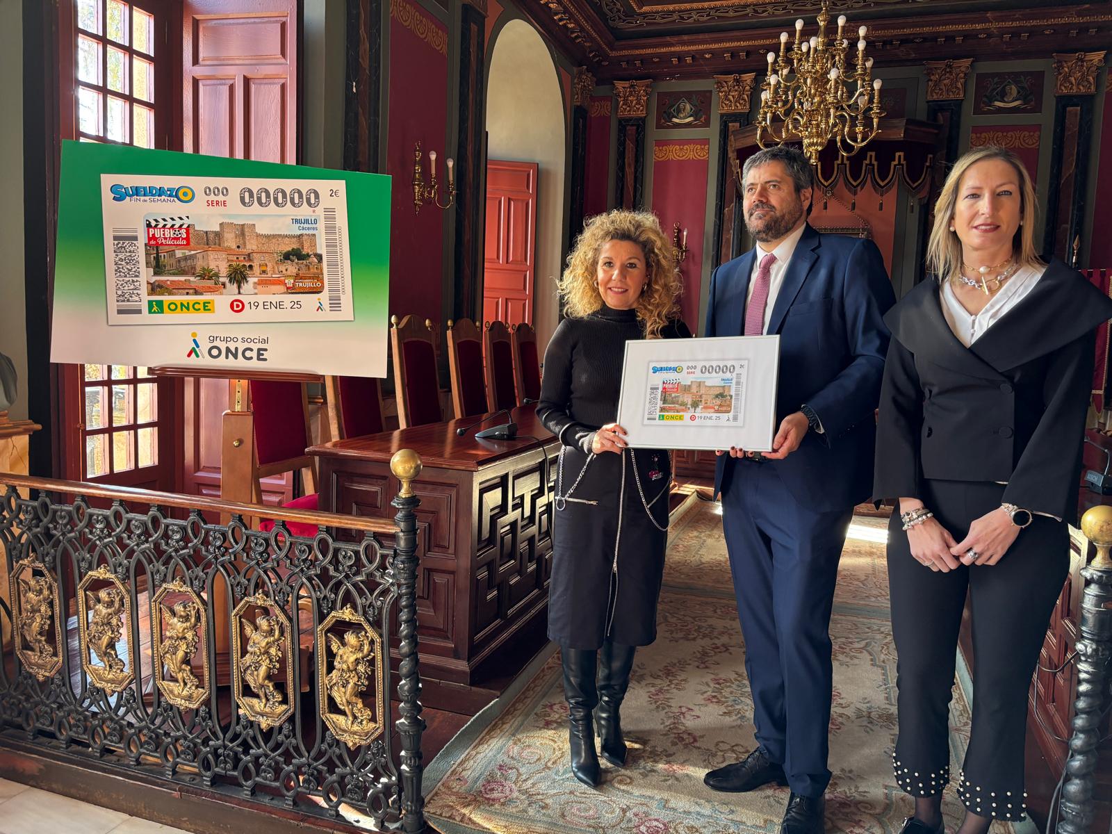 El castillo trujillano será la imagen del cupón de la ONCE de este domingo, 19 de enero, que está incluido en la serie 'Pueblos de película'. De este modo, se repartirán 5,5 millones de ejemplares por toda España con esta llamativa instantánea del fotógrafo Daniel Vega. La iniciativa fue presentada este martes en el salón de plenos del Ayuntamiento, por el delegado de la ONCE de Extremadura, Fernando Iglesias, la alcaldesa anfitriona, Inés Rubio, y la directora de la ONCE en Cáceres, Isabel Góngora.