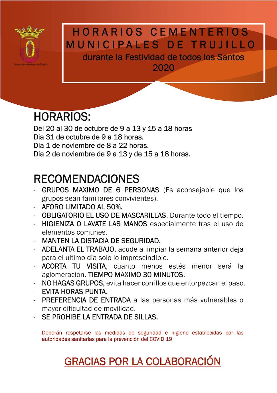 Los días 31 de octubre y 1 de noviembre no se cerrarán a mediodíaEl Ayuntamiento ya tiene definido los horarios de los cementerios con motivo de la festividad de los Santos. Como estaba previsto, se amplían para que ... las personas que lo deseen puedan acceder a los camposantos sin aglomeraciones. De este modo, del 20 al 30 de octubre, estarán abiertos de nueve de la mañana a una de la tarde y de tres a seis de la tarde. El día 31, ese horario de ampliará de nueve de la mañana a seis de la tarde y el 1 de noviembre, del 8 de la mañana a diez de la noche. En ambos casos, no se cerrará a mediodía. Para el 2 de noviembre, se volverá al horario de nueve a una de la tarde y de tres a seis.