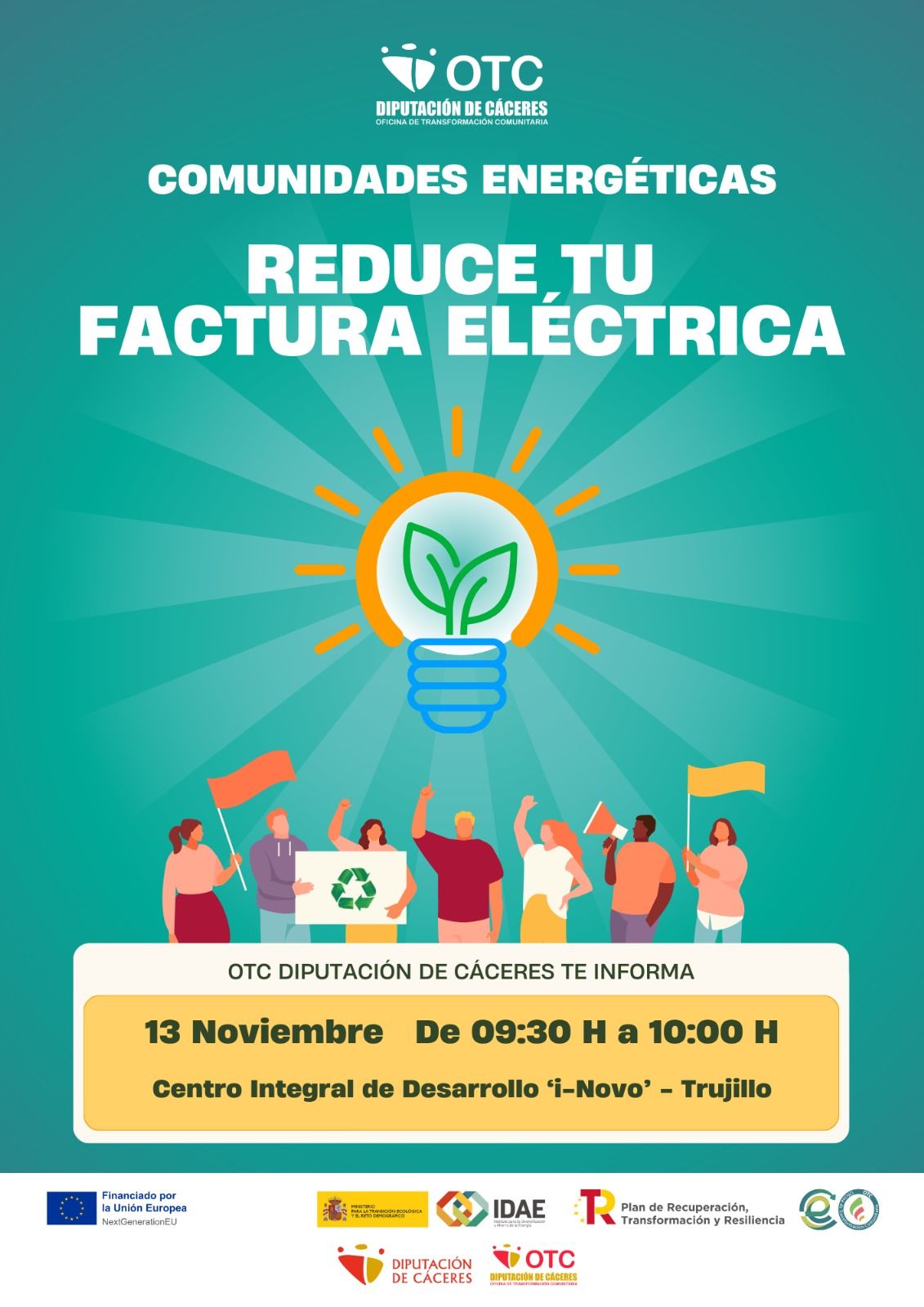 La Diputación Provincial de Cáceres, a través de su Oficina de Transformación Comunitaria (OTC), organiza una charla informativa sobre los beneficios de constituirse en comundiad energética. Tiene como título 'Reduce tu factura de luz' y está dirigida a las pymes. Tendrá lugar esta mañana, a partir de las 9.30 horas, en el centro iNovo.
