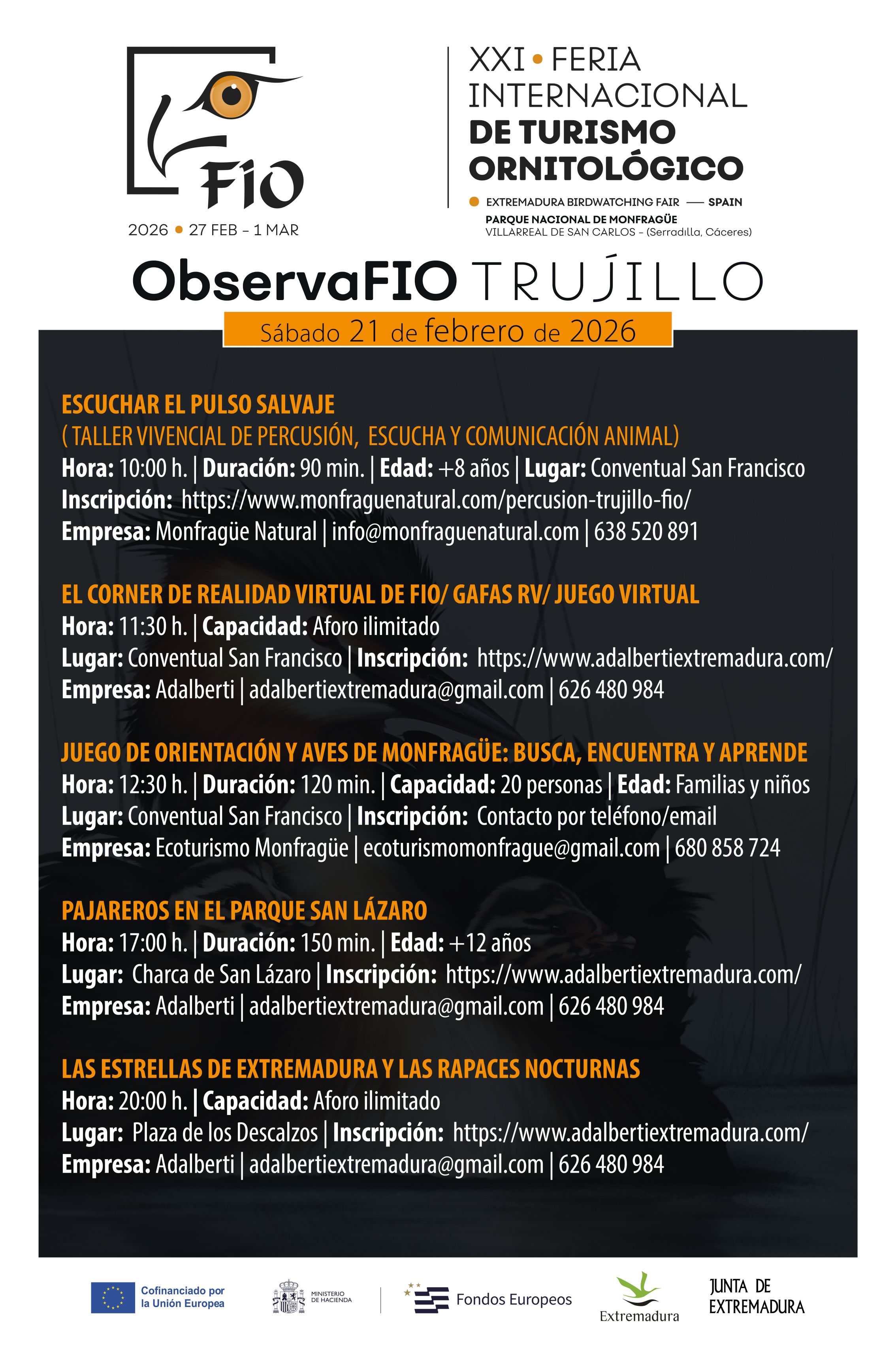 'Observa Fio' contará con diversas propuestas durante toda la jornada. La actividad matutina se centrará en el conventual de San Francisco. La primera propuesta será a las 10.00 horas, con un taller vivencial de percusión escucha y comunicación llamado 'Escuchar el pulso salvaje'. Seguidamente, se llevará a cabo 'el córner de realidad virtual de FIO'. En este mismo escenario, también se realizará el juego de orientación y aves de Monfragüe: busca, encuentra y aprende', según fuentes de la organización.