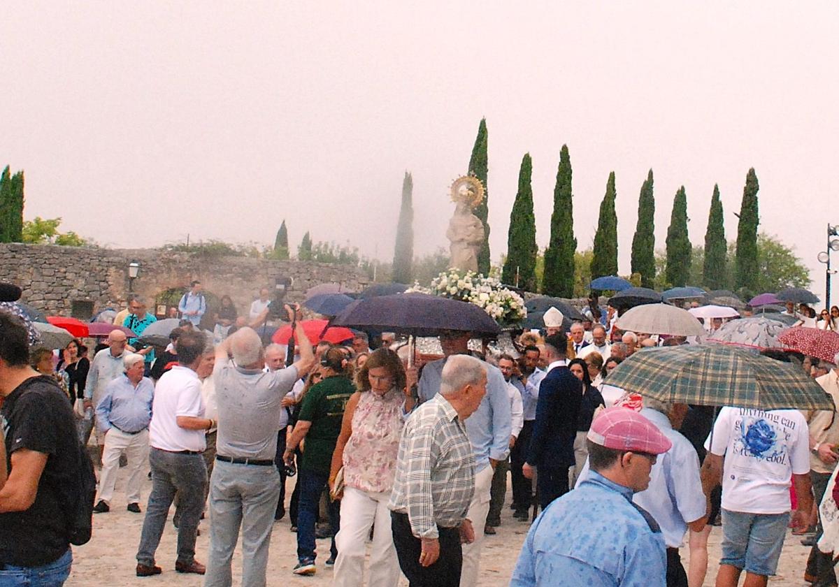 La programación de las fiestas de ayer se abrió camino bajo una jornada propia del otoño, con lluvia incluida, tras el intenso sol del sábado. Los paraguas y la prendas de abrigo estuvieron presentes para acompañar a la Patrona en su regreso a su morada, la ermita del castillo.