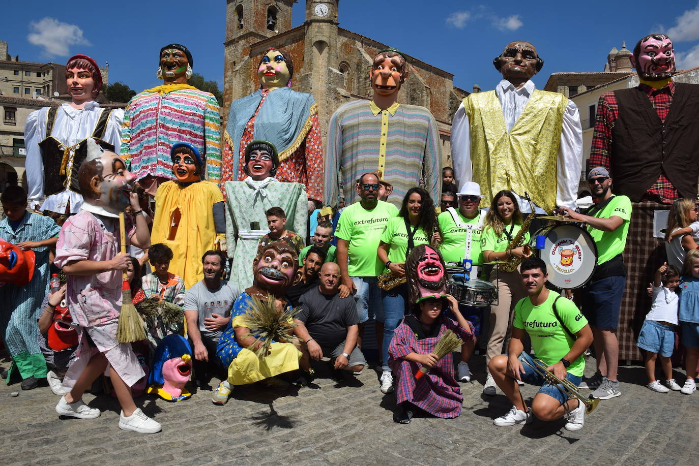 Ya, ese ambiente festivo se empezó a notar, a mediodía, con la salida de los gigantes y cabezudos, que recorrieron las calles principales de la ciudad, seguidos por numerosos menores, así como adultos. El acompañamiento musical lo puso, como es habitual, la charanga La Crisi. No falaron las paradas en diferentes bares para recobrar fuerzas. Pasada las dos de la tarde, esta comitiva hizo su aparición en la plaza Mayor, lo que atrajo a numeroso público. Algunos menores aprovecharon el pilar lleno de agua para refrescarse.