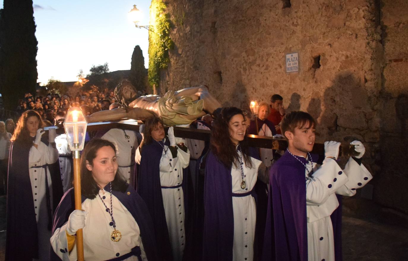 Este 'camino de la cruz' fue dirección a la iglesia de San Francisco escoltado por palacios y casas solariegas llenas de historia. Comenzó pasada las nueve de la noche. En primer lugar, se colocaron los hermanos cofrades, cada uno con sus tradicionales hábitos. Seguidamente, se situó el Crucificado, que fue sacado del templo por componentes del Santo Sepulcro. Integrantes de esta cofradía leyeron las primeras estaciones del Vía Crucis en diferentes puntos del recorrido. Así, según avanzó ese itinerario, las agrupaciones se fueron turnando, tanto en la lectura como en portar la imagen. Después, fue el turno del Cristo del Perdón, seguida de Las Angustias y Cristo Amarrado a la Columna. Su relevo lo cogieron integrantes de la Soledad de los Antiguos Cruzados Eucarísticos. Las últimas tres estaciones fueron leídas por componentes de la Oración en el Huerto y María Magdalena, mientras sus compañeros portaban la imagen hasta llegar a San Francisco.