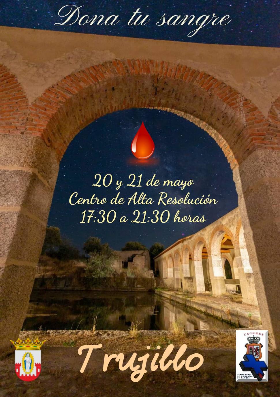 La vecindad podrá donar sangre, una vez más, en el Centro de Alta Resolución de Trujillo, los días 20 y 21 de mayo, de 17.30 a 21.30 horas. Se trata de una de las citas habituales que lleva a cabo la Hermandad Donantes de Sangre de Cáceres en la ciudad trujillana. Esta información viene reflejada en el cartel con una fotografía nocturna de un lugar emblemático para la ciudadanía, como es 'el lavadero', con el mensaje 'dona tu sangre'.