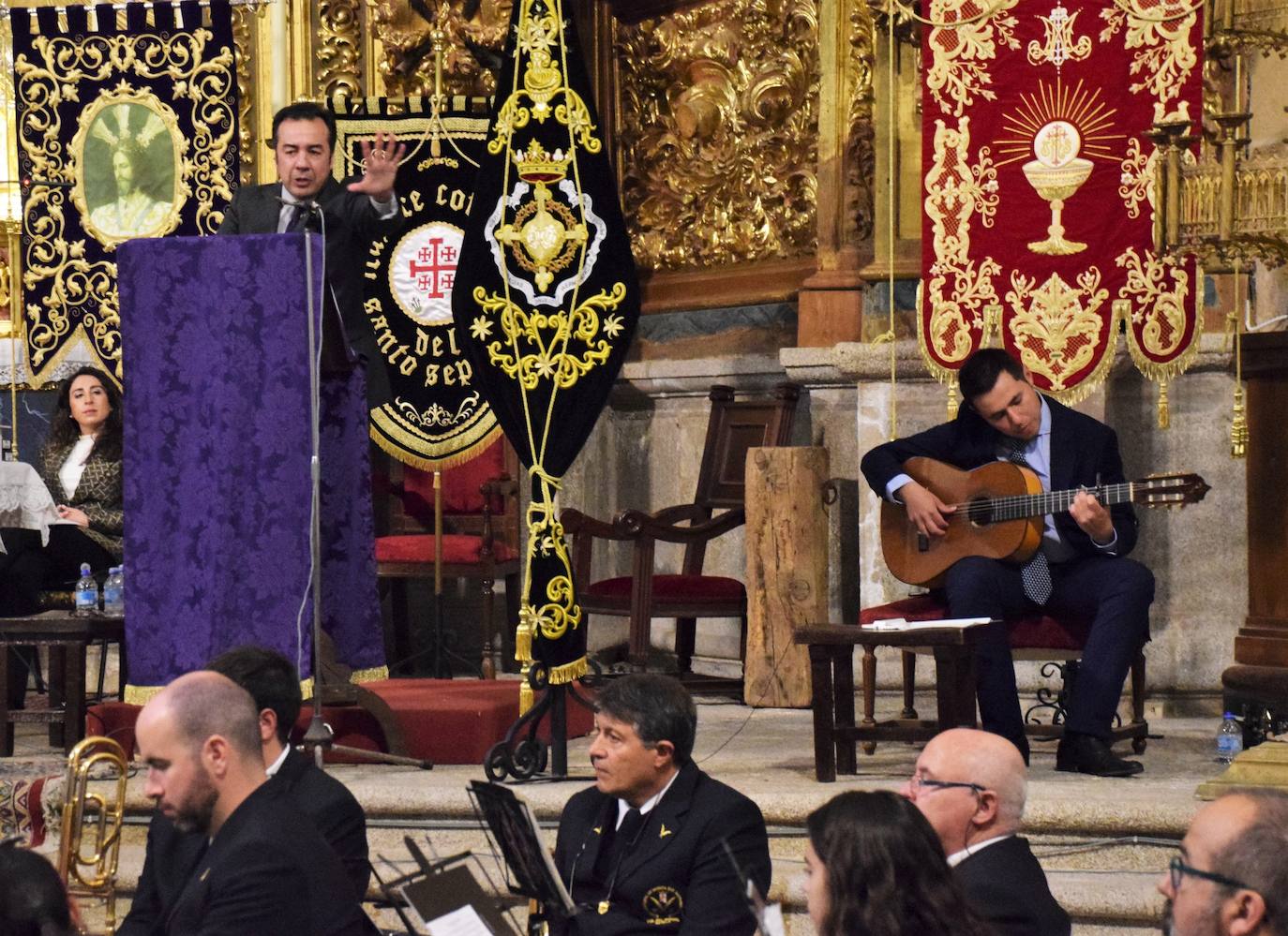 En este recuperado acto, también participó la banda de música San Antonio de PaduaHabía ganas de recuperar, tras dos años de ausencia, uno de los eventos más importantes previo a la semana de Pasión y eso se notó en la forma de materializarlo, con un acto diferente al de otras ediciones. La iglesia de San Francisco acogió ayer el pregón de Semana Santa, ofrecido por el compositor sevillano José León, que demostró toda su pasión delante del micrófono. No faltó la emoción y el recuerdo, además de muchos aplausos.