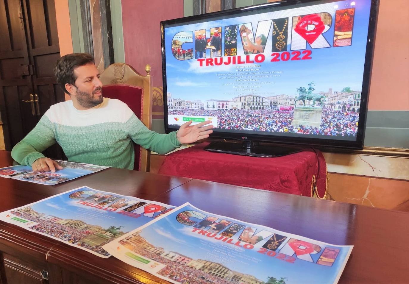 Enrique Borrega ha presentado esta jornada festiva, tras dos años de ausenciaEl concejal de Cultura y Festejos, Enrique Borrega, lo dejó ayer claro. «No es un macrobotellón, es una fiesta de Interés Turístico Regional». El edil hizo esta matización en la presentación, en rueda de prensa, de la fiesta del Chíviri, que tendrá lugar el Domingo de Resurrección, 17 de abril, en la plaza Mayor trujillana y en la que se espera una gran afluencia de público. También aprovechó para dar a conocer el cartel anunciador de esta jornada festiva, una de las más características de la ciudad y que se vuelve a celebrar, tras dos años de ausencia.