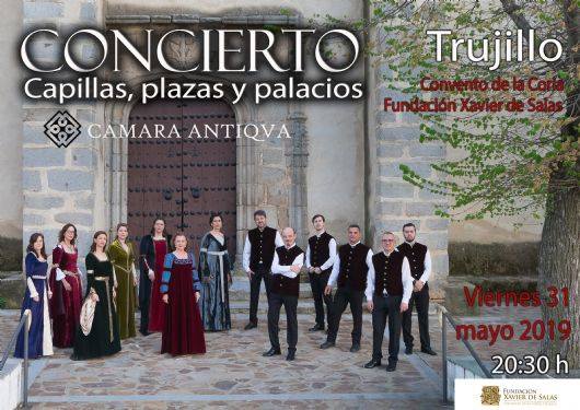 El conventual La Coria acogerá hoy un recital del grupo de música antigua 'Camara Antiqua'. Se titula 'Capillas, plazas y palacios'. Esta formación extremeña, dirigida ... por Manuel Guisado, ofrecerá una selección de obras nacidas entre los siglos XV y XVIII. La entrada será gratuita hasta completar aforo. Será a las 20.30 horas.