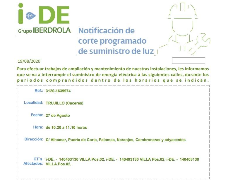 Afectará a las vías Alhamar, Puerta de Coria, Palomas, Naranjos, Cambroneras.El Ayuntamiento, a través de Iberdrola, informa del corte del suministro de energía eléctrica que se producirá el 27 de agosto, con el fin de ... efectuar trabajos de ampliación y mantenimiento de las instalaciones de la entidad. Se producirá de 10.20 a 11 horas y afectará a las calles Alhamar, Puerta de Coria, Palomas, Naranjos, Cambroneras, así como vías aledañas.