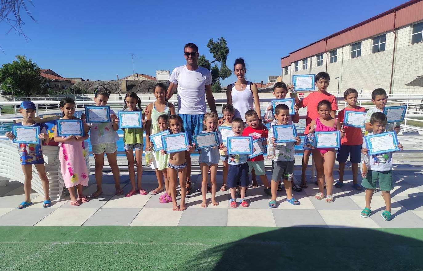 Los campamentos urbanos y los cursos en las piscinas municipales han centrado parte de la actividad lúdica estival«Son ya unos nadadores profesionales». Era el mensaje que lanzaba ayer uno de los monitores, Carlos Catalán, a los padres y madres en la clausura de uno de los cursos de natación que se ha llevado a cabo durante este mes. Mientras, los más pequeños, estaban con diploma en mano, satisfechos del trabajo realizado. Y es que estos cursos, junto a los campamentos urbanos, han sido dos de las propuestas infantiles que han copado el mes de julio. Ambas han estado promovidas por el Ayuntamiento a través de 'Iter Terrae'. Su coordinadora, Fátima Retamosa, resalta la buena participación que han tenido las dos iniciativas.