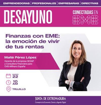 Esta iniciativa ofrece diferentes recursos y actividades. Una de ellas tendrá lugar este martes en Trujillo. Se trata de un desayuno titulado 'Finanzas con EME: la emoción de vivir de tus rentas'. Su ponente será Maité Pérez López, gerente de la empresa GESAP, Consultora Financiera para OVB Allfinanz España. Tendrá lugar a las las diez de la mañana, en el hotel Las Cigüeñas.