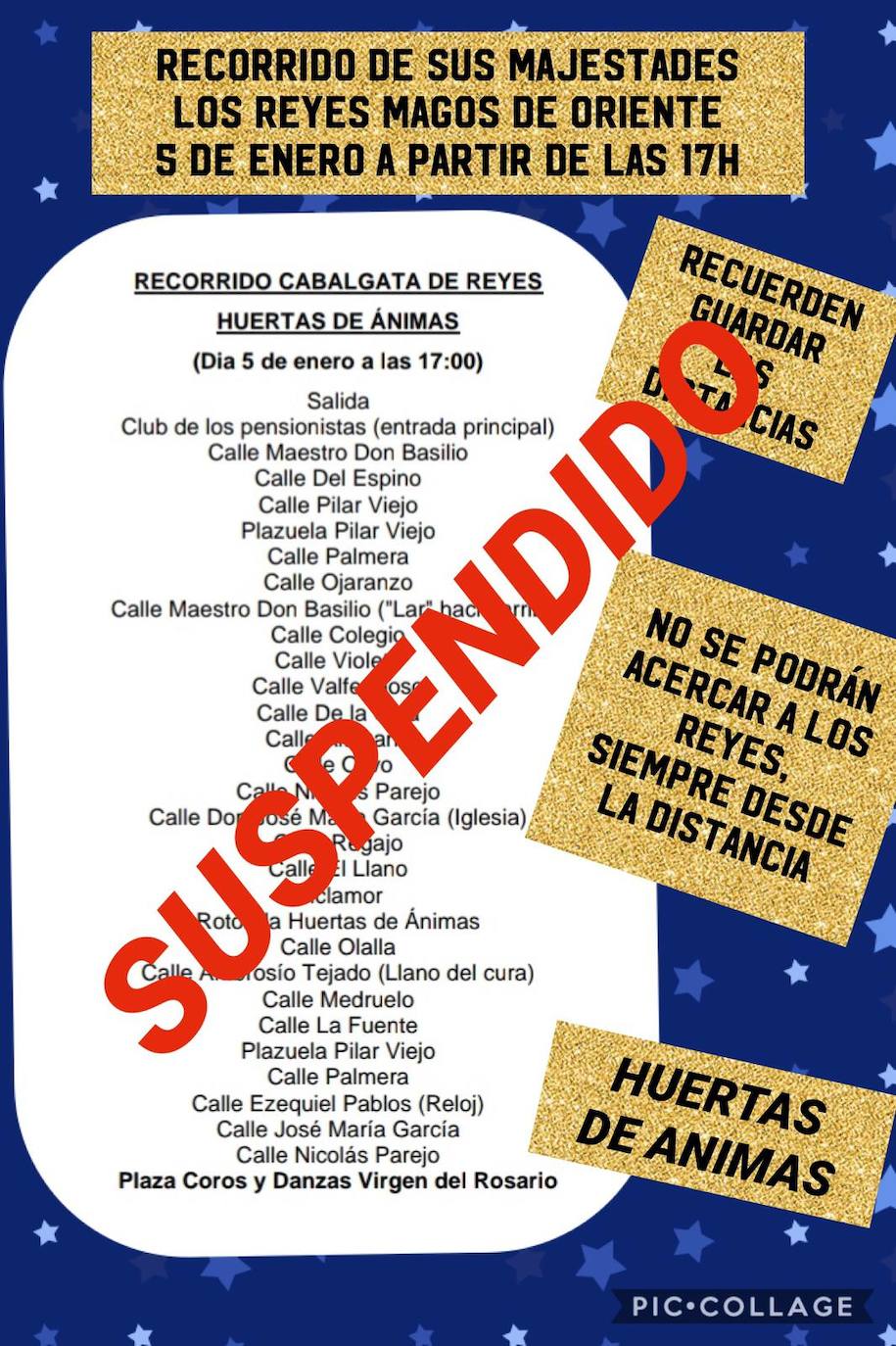La entidad organizadora, la asociación Belén Viviente, indica en un comunicado que, muy a su pesar, «tenemos que ser responsables y acatar por el bien de todos»Los Reyes Magos no recorrerán el 5 de enero las calles de Huertas de Ánimas para ver a grandes y pequeños, como estaba previsto. La ... actividad se ha tenido que suspender debido a la situación sanitaria. En un comunicado hecho público por la entidad organizadora, la asociación Belén Viviente, se detalla que «debido al incremento importante de positivos en Extremadura en los últimos días, se han suspendido todas las actividades que puedan aglomerar a personas en las vías públicas, más cuando son complejas de contener o prever». Así se los han detallado superiores policiales a este colectivo, se señala en el escrito.
