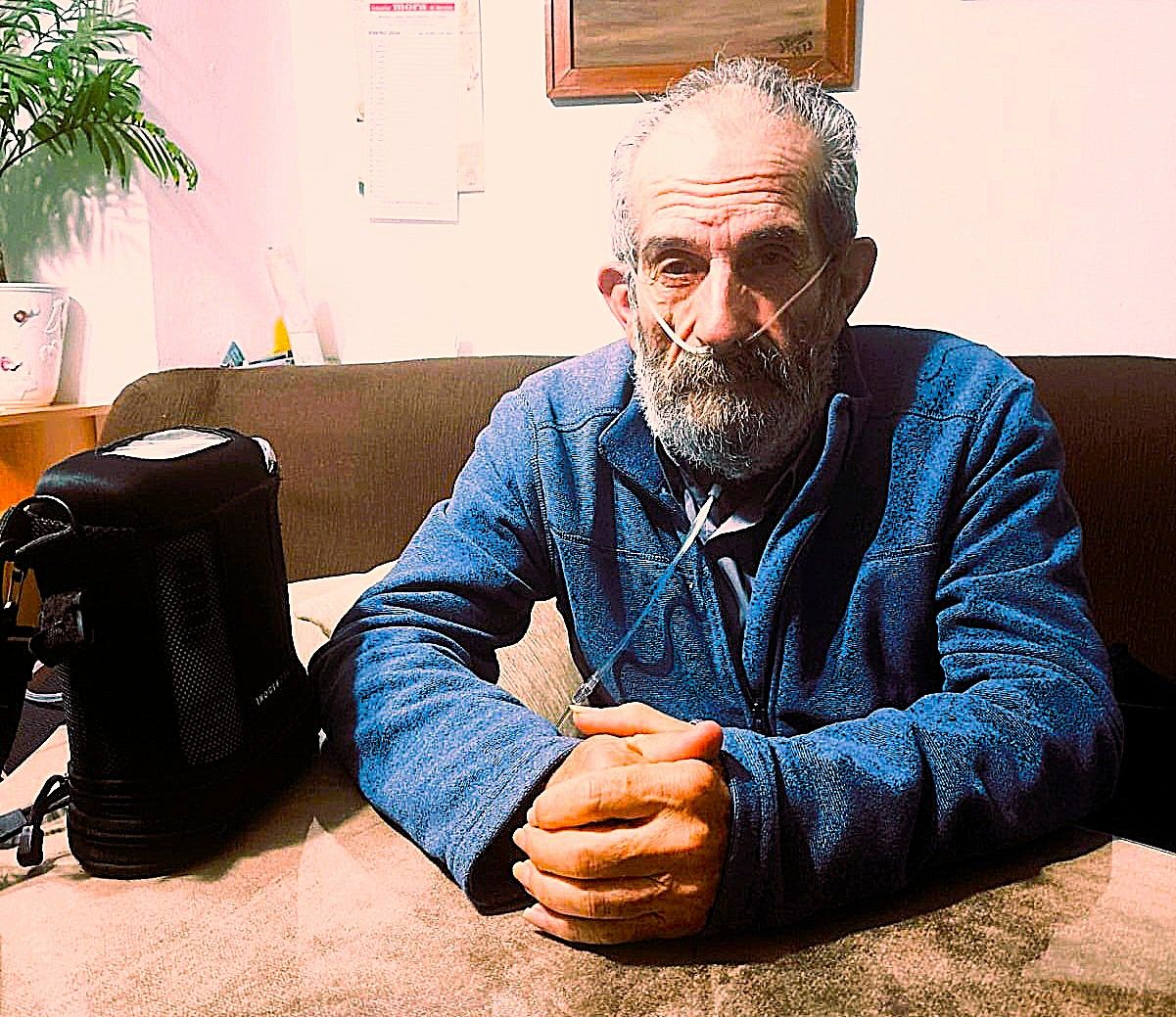 Poveda padece la enfermedad pulmonar obstructiva crónica (EPOC), ya en estado grave, lo que le provoca gran dificultad para respirar. Por tanto, el oxígeno que le aporta esta máquina es imprescindible en su día a día.