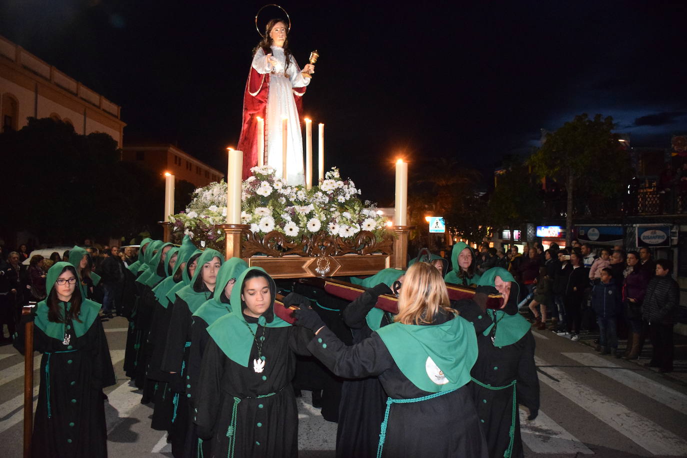 La Oración en el Huerto, cargada entre 20 y 25 hombres, saldrá desde la iglesia de San Francisco, acompañada de la banda de tambores de la agrupación. Irá dirección plazuela de Aragón y calle Jacinto Ruiz de Mendoza hasta Ramón y Cajal. A esa misma hora, La Magdalena, llevada entre otras tantas mujeres, saldrá, como novedad, desde la iglesia de La Merced, que ha sido cedida por el Ayuntamiento para la ocasión. En los últimos años, partía de la iglesia de los Hermanos. Sin embargo, no está en las condiciones idóneas, apunta el presidente de la entidad, Javier Beato. Este paso, que estrena faroles, irá dirección calle Encarnación, acompañada por la banda de tambores del Santo Sepulcro.