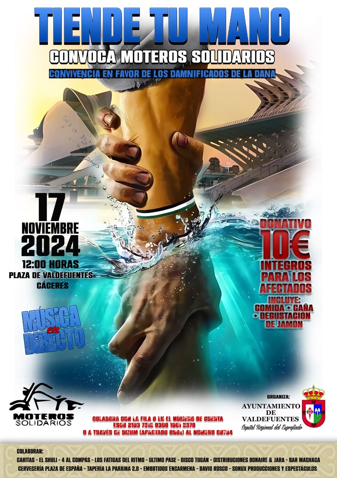 Fuentes de la organización, a través de una nota de prensa, señalan que los participantes colaborarán con 10 euros, que se destinarán íntegramente a las personas perjudicadas de las zonas afectadas por las graves inundaciones. A todos esos colaboradores, «se les hará entrega de tres tickets para canjear por paella y dos consumiciones, donadas por distintos establecimientos locales, y podrán disfrutar de música en directo en un ambiente festivo y de camaradería», señalan. Se cuenta con la colaboración del Ayuntamiento de Valdefuentes.