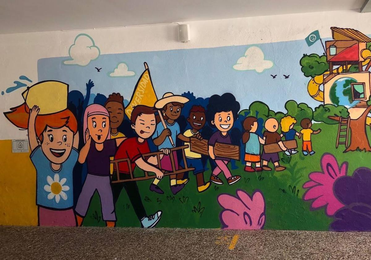Una de sus coordinadoras, la trujillana Victoria Donaire, apunta que ese vistoso trabajo del mural representa la convivencia, la interculturalidad y la diversidad en el alumnado. De hecho, se muestran niños y niñas de diferentes culturas en una zona de juego, además de una bola del mundo. Explica que, en un principio, el artista hizo un boceto en la pared. A partir de ahí, los menores fueron dando color a esta obra, mediante espray y brocha, con las pautas de Tomé.