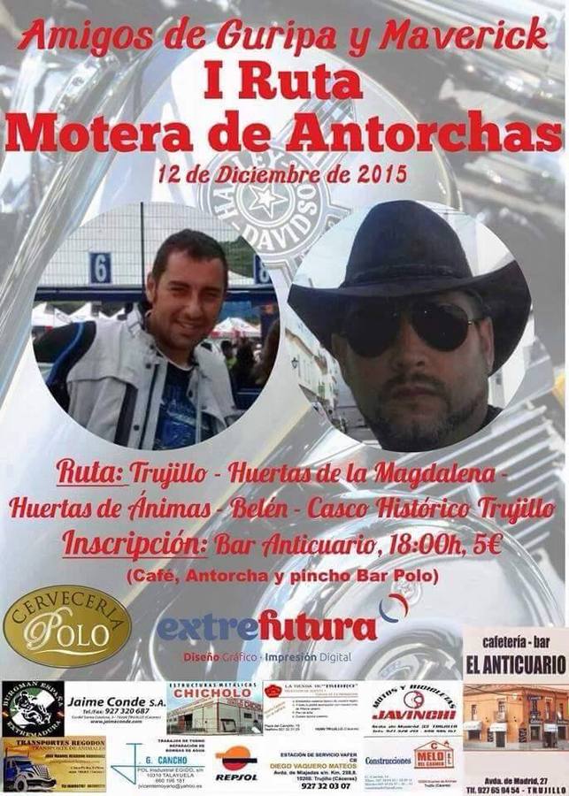 Diferentes moteros de la ciudad se han unido para hacer una original iniciativa. Este sábado, a las seis de la tarde, llevarán a cabo la ... I Ruta Motera de las Antorchas, en honor de dos compañeros fallecidos recientemente, conocidos popularmente como 'Guripa y Maverick, según destacan fuentes de la organización. La salida tendrá lugar en la barriada de la Piedad. Desde ahí, Los participantes, portando antorchas, irán dirección Huertas de la Magdalena, Huertas de Ánimas y Belén. Seguidamente pasarán por la plaza Mayor y parte antigua de la ciudad, a una velocidad muy lenta. «Es la primera vez que se lleva a cabo en Trujillo y puede resultar muy bonito», detallan estas mismas fuentes.