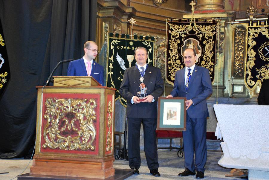 Tras las intervenciones, llegó el momento de los homenajes. Enrique Elías fue nombrado cofrade de honor por la Junta de Cofradías. Se debe a que es una persona que siempre ha estado muy implicado con las procesiones y los pasos y, sobre todo, con el del Cristo Cautivo y San Juan. Fue uno de los pioneros en relanzar esta semana de Pasión en Trujillo, según Torres.