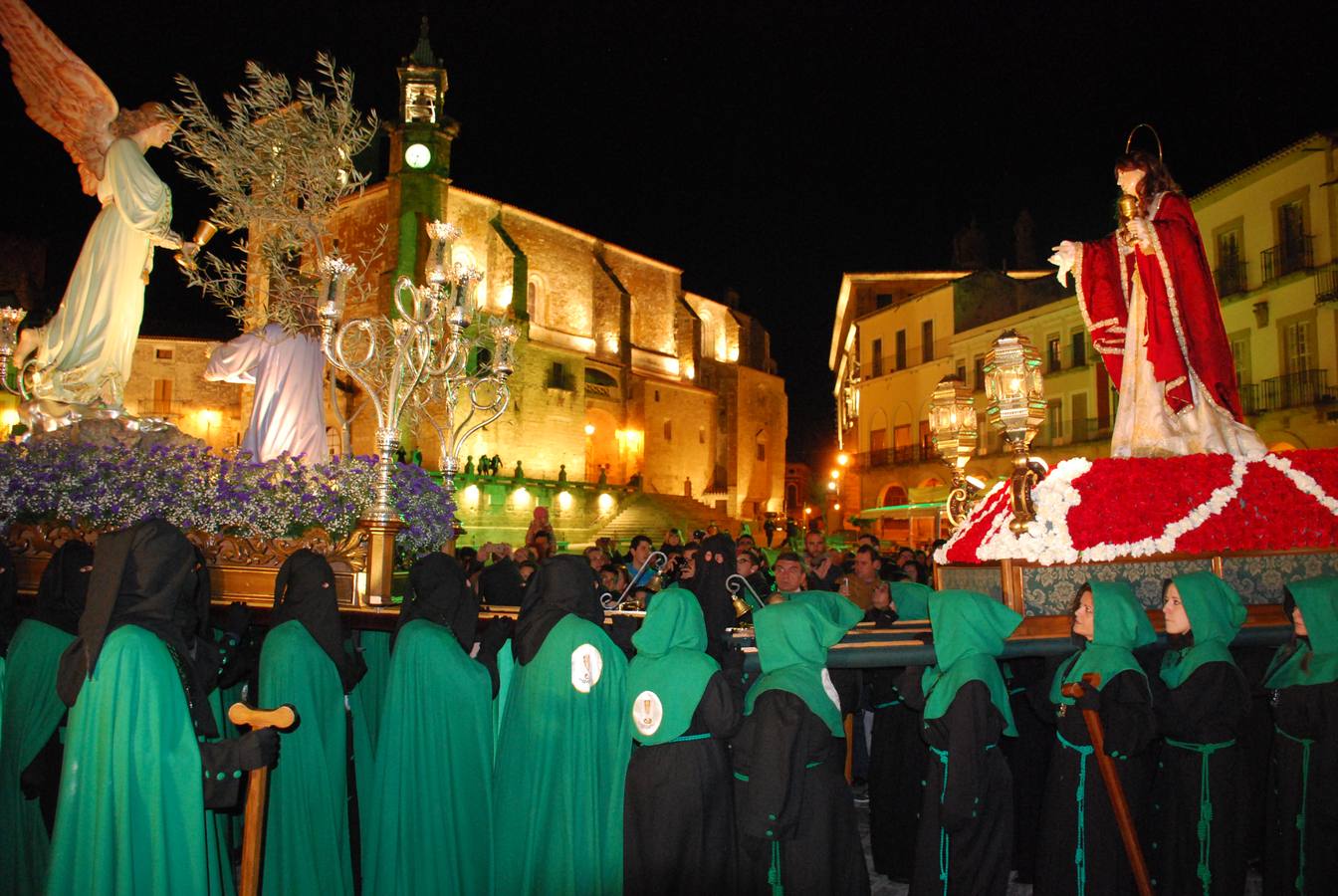 Las dos comitivas se dirigieron a la plaza Mayor. El primer paso fue por calle Herreros y Hernando Pizarro. La Magdalena fue por Sofraga y Sillerías. Una vez en la plaza, se produjo el encuentro de las dos imágenes, uniéndose frente a frente, ante la atenta mirada de decenas de vecinos y turistas. El vecino Antonio Salcedo cantó dos saetas. Después, las dos comitivas se dirigieron a la iglesia de San Francisco. Volverán a salir en la procesión magna de mañana.