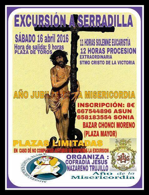 Tras la intensa Semana Santa, con diversas propuestas, hay agrupaciones que no paran. Es el caso de la Cofradía Nuestro Padre Jesús Nazareno. Se debe ... a que han organizado un viaje a Serradilla, con motivo del Año Jubilar de la Misericordia. Esta excursión tendrá lugar el 16 de abril, a las nueve de la mañana. La salida se realizará en los aledaños de la plaza de toros. La inscripción tiene un precio de ocho euros y las plazas son limitadas.
