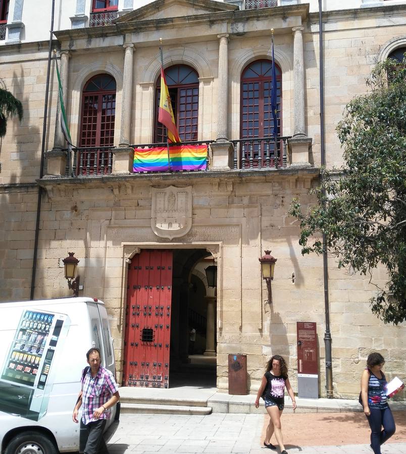 El Ayuntamiento de Trujillo no quiso dejar pasar la oportunidad para reivindicar El Día Internacional del Orgullo LGBT (lesbiana, gay, bisexual y transexual), más conocido ... como día del Orgullo Gay. Para ello, se colocó una bandera multicolor en el balcón de la casa consistorial. Con este gesto, se reivindica la igualdad de trato y los derechos del colectivo gay y de lesbianas y transexuales.