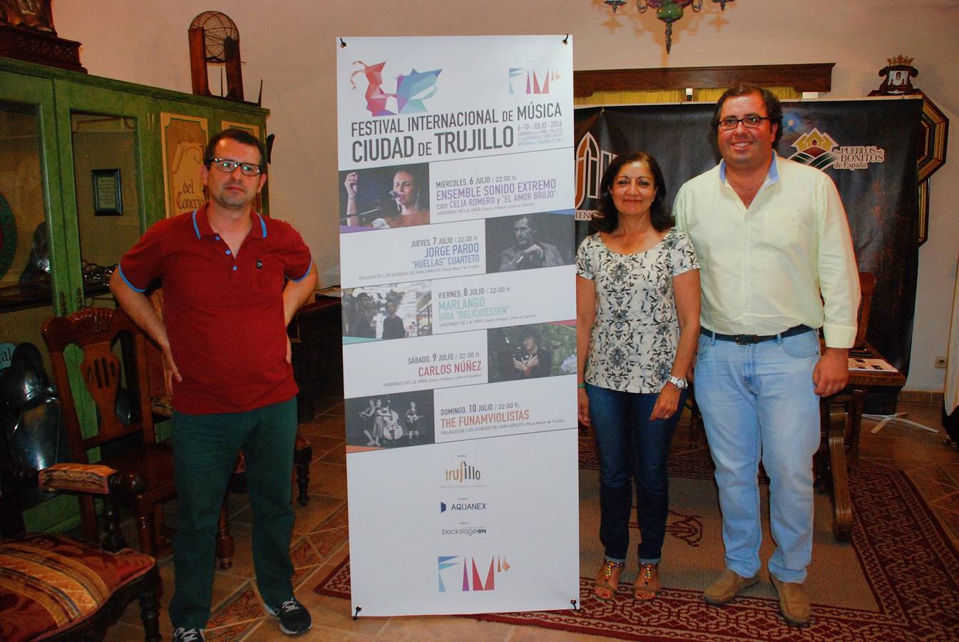 Nuevos estilos, con la presencia de Marlango y Carlos Núñez, entre otros. Así se presenta El VI Festival Internacional de Música (FIM) Ciudad de Trujillo, ... que tendrá lugar del 6 al 10 de julio. El alcalde, Alberto Casero, recuerda que los orígenes de este evento sirvieron para potenciar la música clásica. En esta edición, se ha dado un paso más, incluyendo a otras formas, «con artistas de primerísimo nivel, a los que no se les va a poder ver en otros lugares de la región». Estos espectáculos tendrán lugar en escenarios únicos, como son los Jardines de la Viña, en la parte antigua de la ciudad y el palacio de los Duques de San Carlos, junto a la plaza Mayor.
