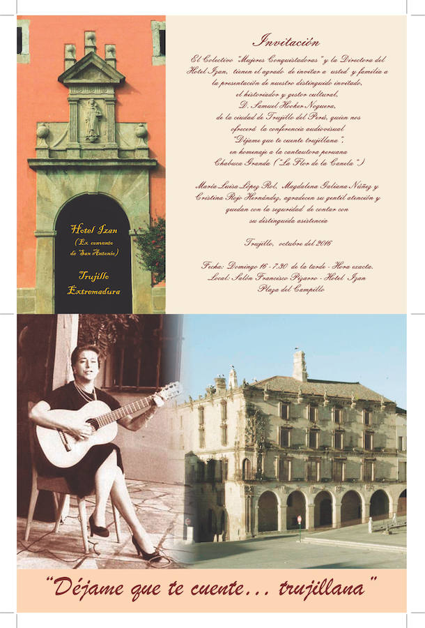Aprovechando su llegada, ofrecerá dos conferencias. Una de ellas, promovidas por el colectivo Mujeres Conquistadoras, tendrá lugar el 16 de octubre, a las 19.30 horas, en el hotel Izan. Se titula Déjame que te cuente trujillana en homenaje a la cantautora peruana Chabuca Granda.