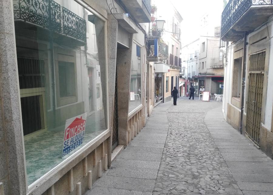 Una de las vías más significativas es la calle Tiendas. Al menos, tiene diez espacios que están sin abrir. Ha habido desde inmuebles con productos extremeños, hasta tienda de regalos, pasando por una zapatería, pastelería y una librería, entre otros. Ahora, sus escaparates ya no tienen vida. Otra prueba es la calle Sillerías. En la actualidad, esta vía cuenta con más locales de hostelería que tiendas. Solo hay dos y a una de ellas le gustaría trasladarse. Además, posee ocho espacios comerciales cerrados.