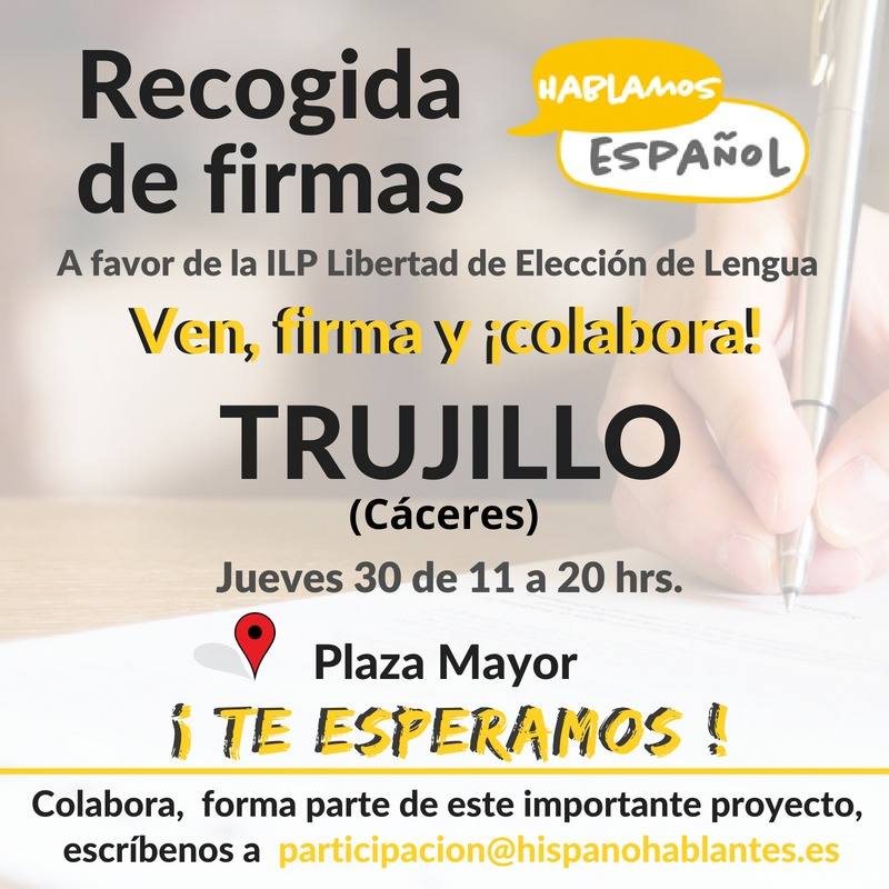 La Asociación Hablamos Español va a continuar con su campaña en apoyo al español. Para ello, hoy, en Trujillo, se recogerán firmas. Según fuentes de ... la organización, el fin último es conseguir que, en Cataluña, País Vasco, Galicia, Valencia y Baleares se pueda elegir estudiar español. También se pide que los organismos oficiales en estas comunidades utilicen los dos idiomas oficiales en documentos, carteles y señales, así como que los profesionales puedan trabajar en la función pública en cualquier sitio de España sin barreras lingüísticas.