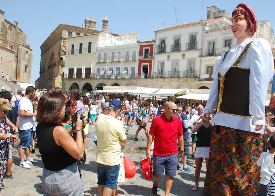 Aunque las propuestas programadas comenzaron a partir de las ocho de la mañana con la diana floreada, la mayoría de los vecinos inició esa actividad festiva a mediodía. Los sitios más concurridos fueron los espacios climatizados y los lugares de sombra. Gran parte de esos asistentes se reunieron en la Plaza Mayor, a la espera de la llegada de los gigantes y cabezudos, acompañados de la charanga La Crisi. Salieron del Ayuntamiento a las doce y recorrieron distintos lugares de la ciudad. Pasadas las 14.15 horas, hicieron su entrada en la plaza, para el disfrute, sobre todo, de los más pequeños.