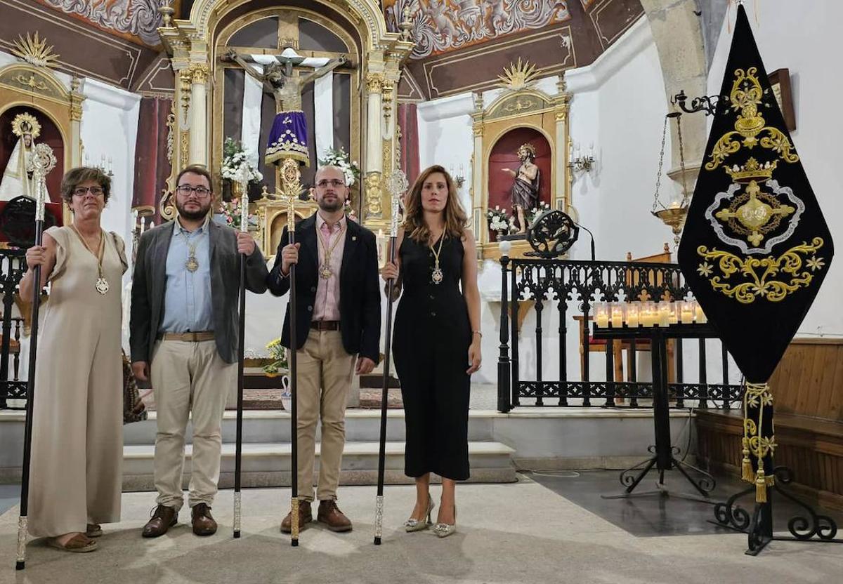 El momento más esperado, dentro de la misa, fue esa toma de posesión de los cuatro nuevos directivos, bajo la fórmula de juramento de sus cargos de responsabilidad. Así lo hizo, en primer lugar, el presidente, Manuel Quesada, seguido de la vicepresidenta Angélica Gaspar; el secretario, Manuel Díaz y la tesorera Inés Alía. De igual modo, cada uno de ellos cogió el bastón de mando de manos del párroco.