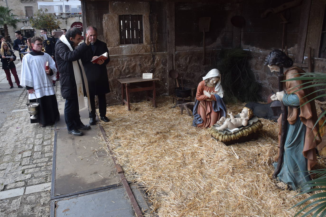 Uno de los momentos esperados fue la inauguración y bendición del belén que ha montado, como cada año, la Hermandad Virgen de la Victoria en la plaza Mayor y que también contó con numerosas personas. Además, esta bendición del obispo placentino, acompañado por el párroco Juan Carlos Milla, estuvo amenizado por la Banda de Música de Trujillo Antonio Flores, que, por fin, retoma sus actuaciones tras la pandemia. La formación musical también participó en la eucaristía. El prelado placentino igualmente, bendijo el belén de la junta local de la Asociación Española Contra el Cáncer, que tiene su tienda solidaria en la plaza, además del nacimiento de la familia Blázquez Muñoz.