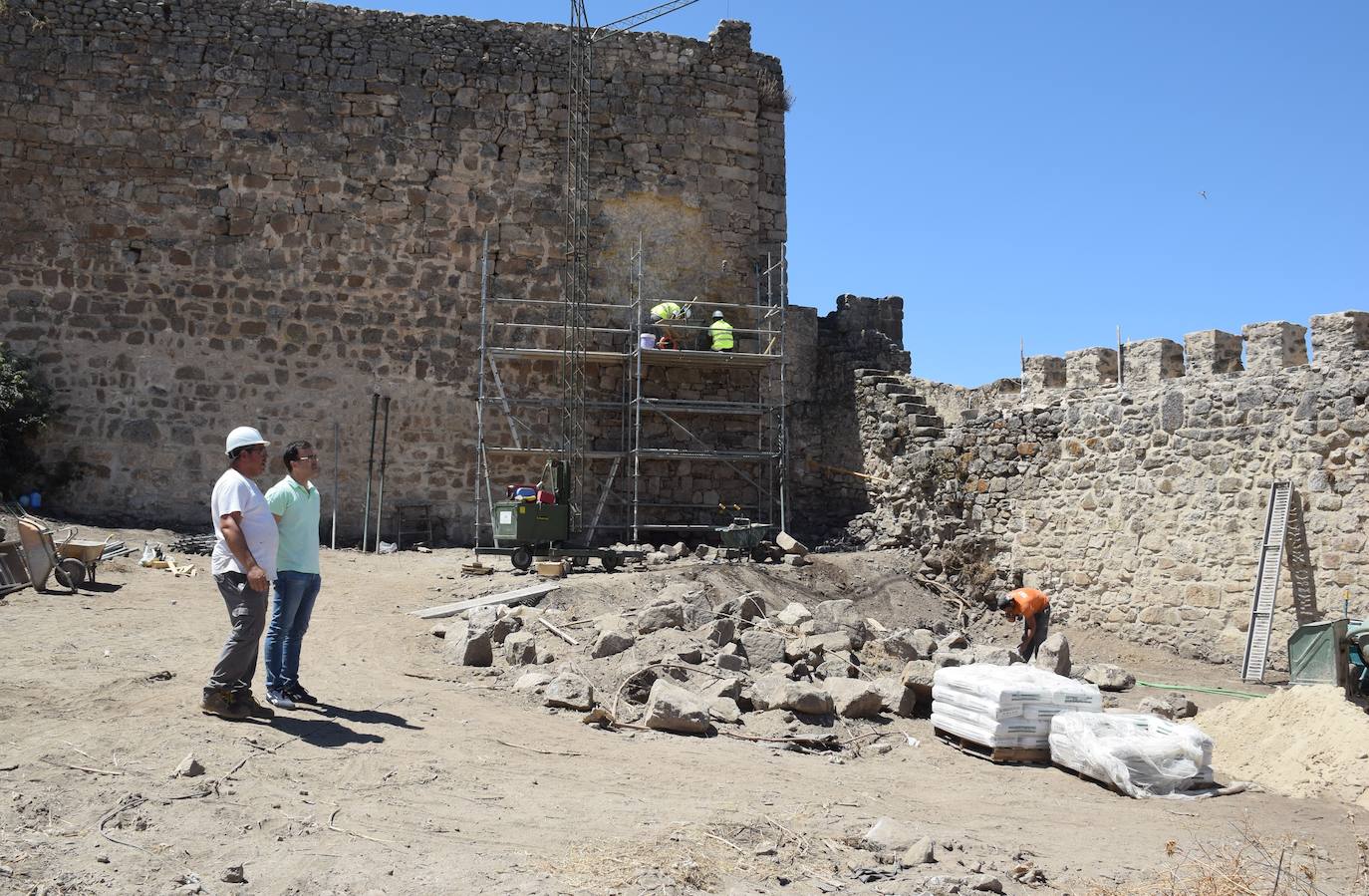 El concejal delegado, Raúl Gómez, explica que se está interviniendo en algo más de 200 metros de esa muralla. Estas obras comenzaron en mayo y, si no surge ningún problema, podrían estar terminadas a finales de septiembre. Según el proyecto, se ha tenido que hacer una restauración con mampostería granítica con mortero de cal e inyección de mortero de cal hidráulica. Antes de nada, se han desmontado las partes inestables. También se han consolidado los merlones. Para todo ello se ha utilizado la piedra existente en la zona.