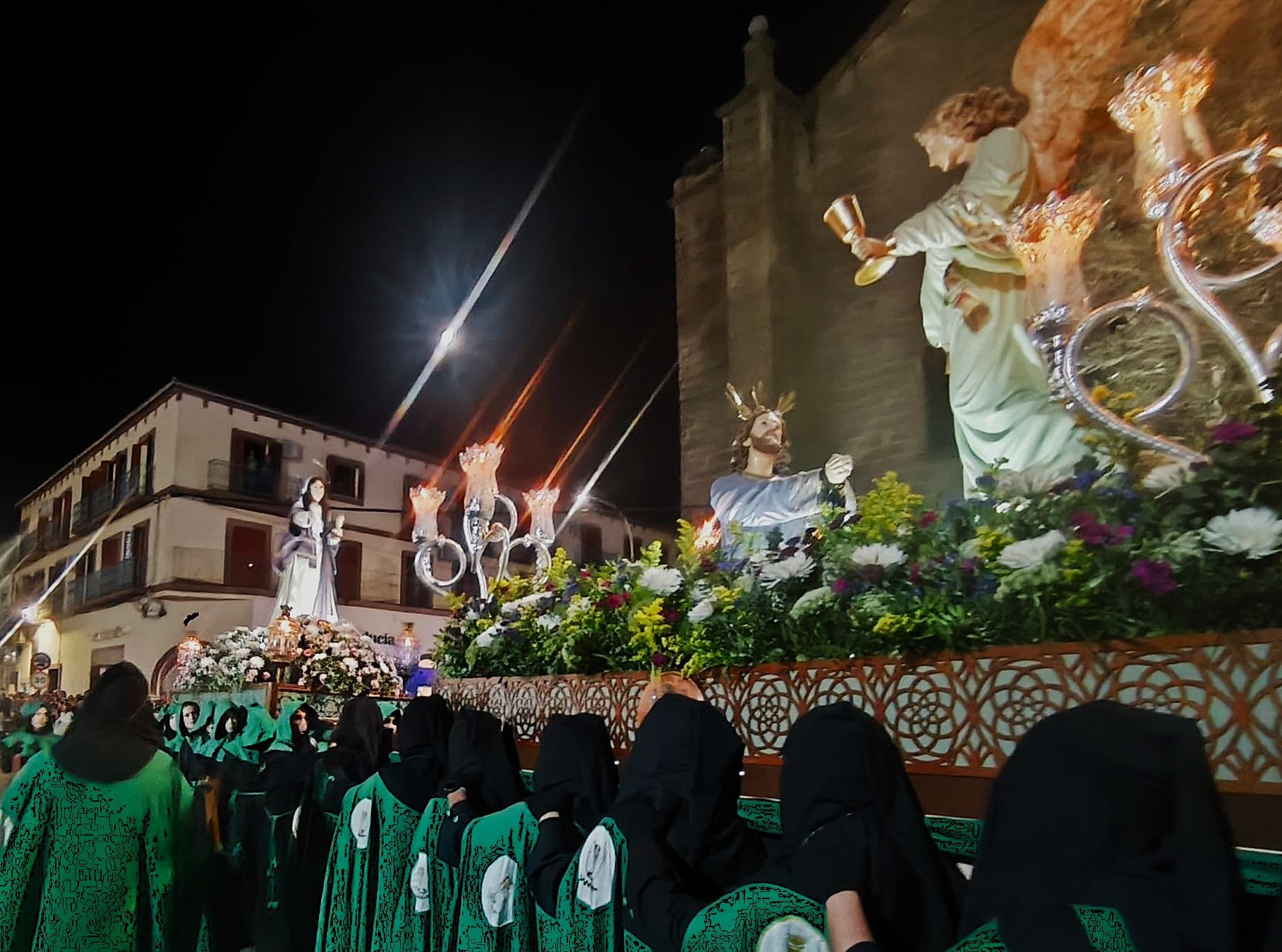 Sobre las 21.15 horas, se inició la procesión con María Magdalena, llevada solo por mujeres. Estuvo acompañada por la banda de tambores de la cofradía del Santo Sepulcro. Ambos pasos simbolizaron su encuentro a la altura de la iglesia de Los Hermanos. Seguidamente, se dirigieron a la iglesia de San Francisco.