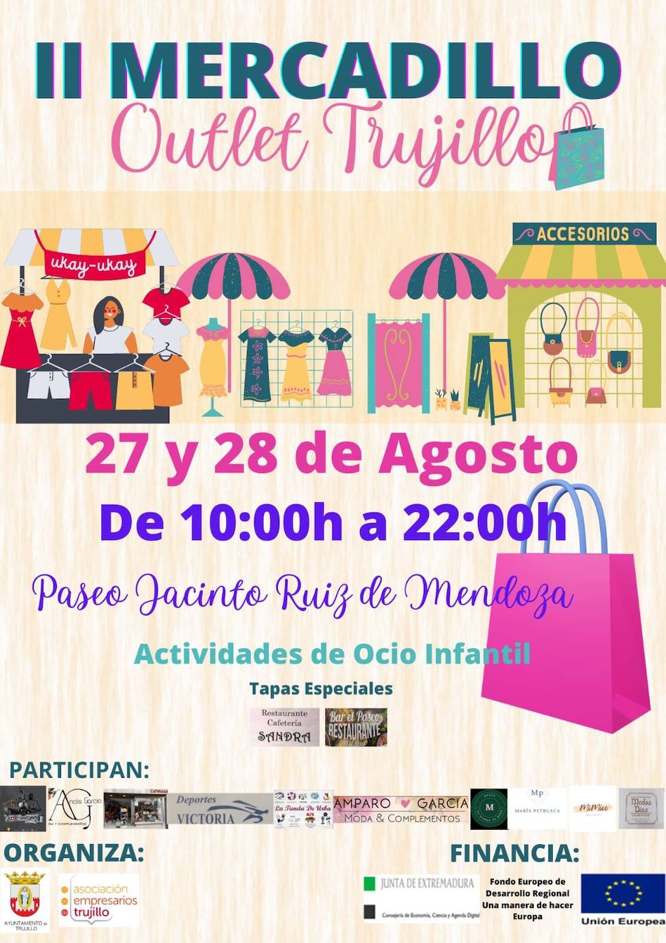 Participan 10 empresarios mostrando sus artículos. Además, hay actividades infantiles y degustación de tapas en establecimientos de la zonaOutlet, que tiene lugar desde hoy y hasta mañana, en el paseo Ruiz de Mendoza. Está organizado por el Ayuntamiento y la Asociación de Empresarios de Trujillo (ASEMTRU), con la ayuda de la Junta. Los diez empresarios participantes están situados en pequeñas casetas, en forma de jaimas, para mostrar sus artículos. Gran parte de ellos están relacionados con el textil y complementos, aunque también se muestran otro tipo de productos.