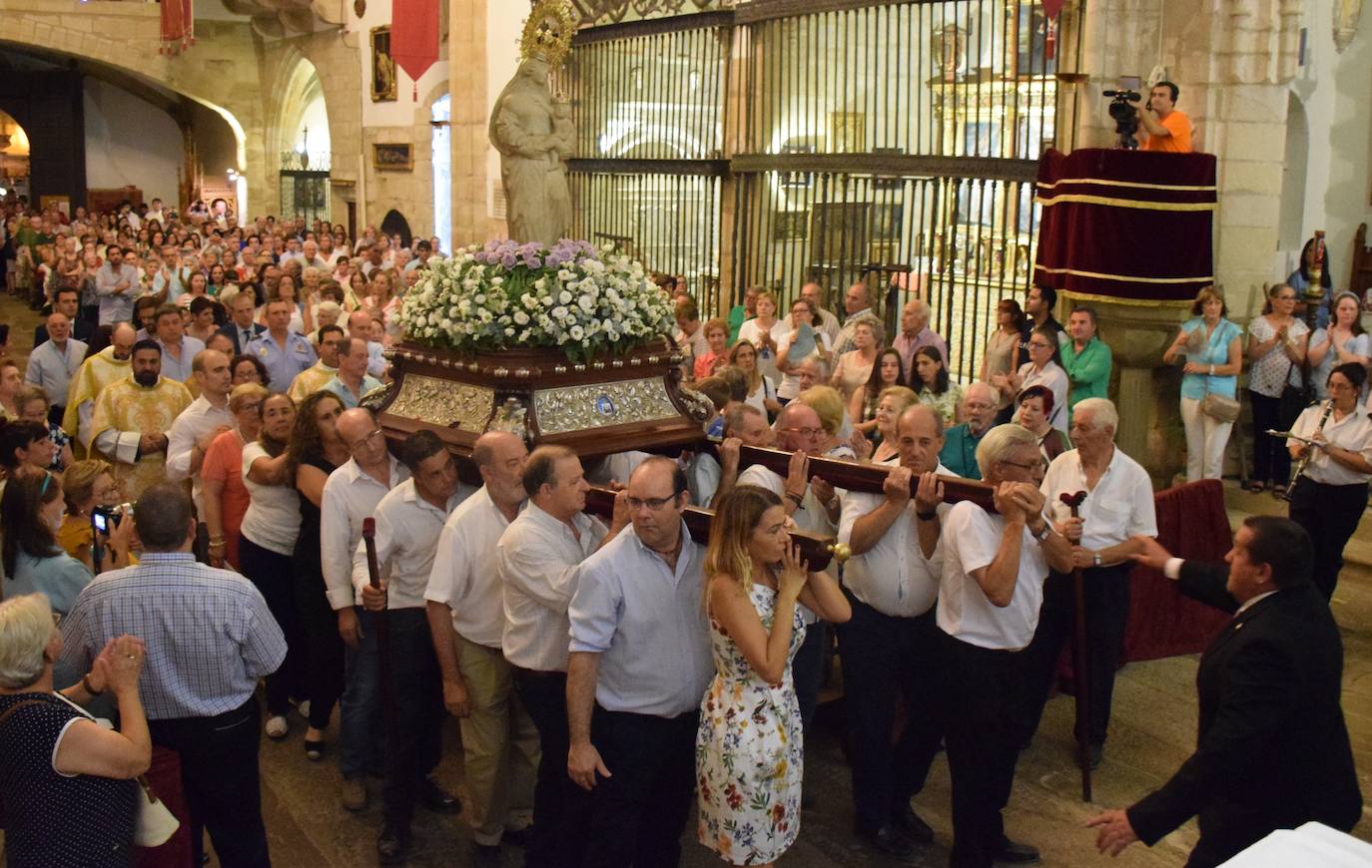 La Patrona baja, en procesión, a la iglesia de San Martín, arropada por decenas de personas