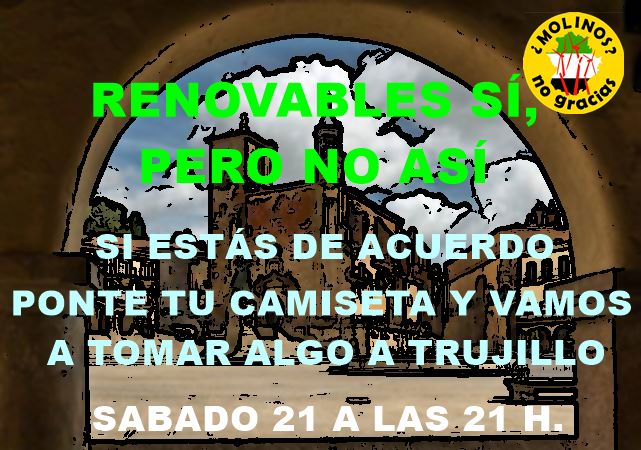 Asimismo, se recuerda que el único fin es informar de la situación que puede generar estas iniciativas eólicas en la zona. «No es una asamblea ni convocatoria, simplemente es un acto espontáneo para compartir una charla amigable con todos los trujillanos que estén interesados», añaden desde la entidad.