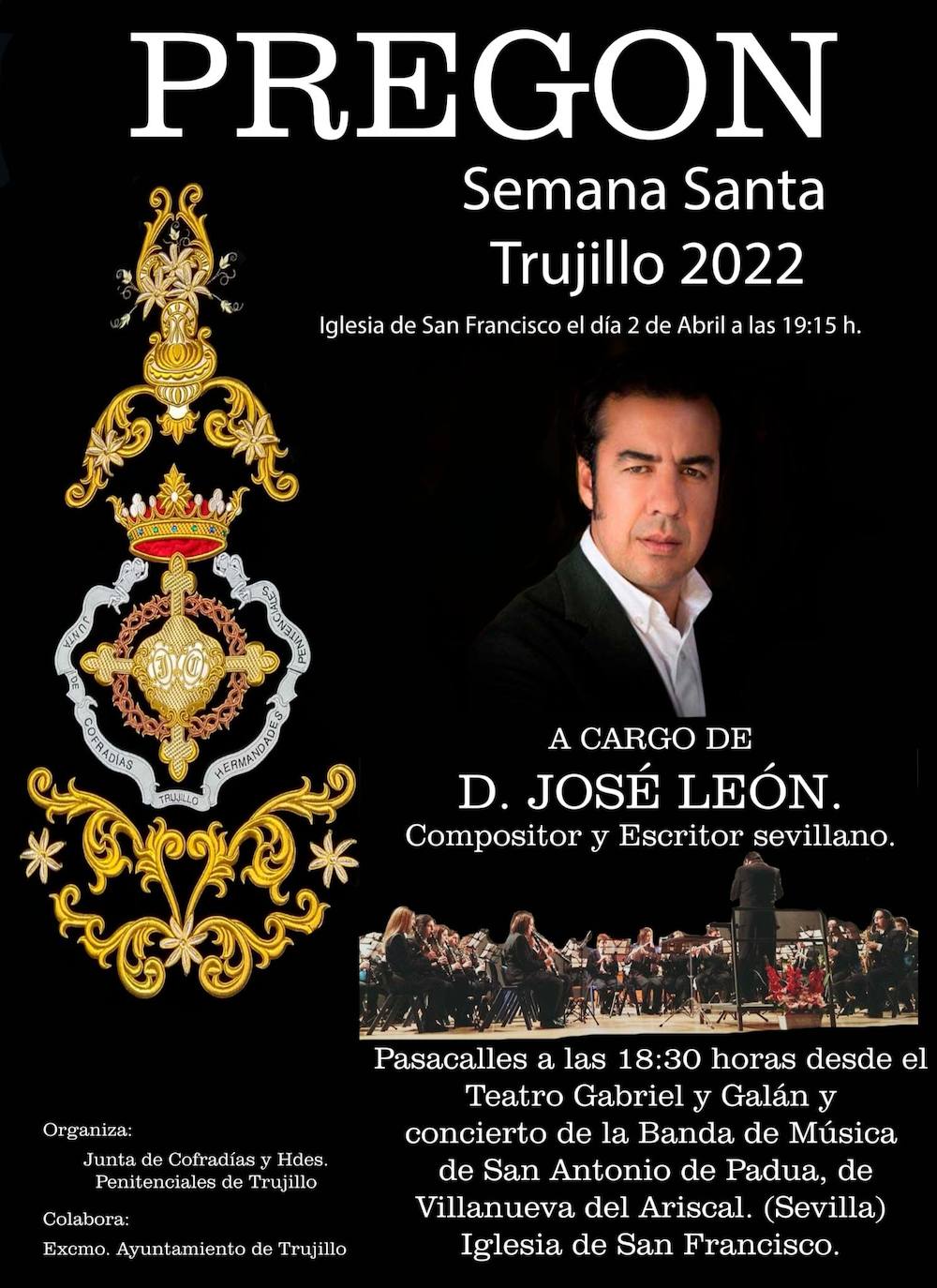 Antes, a las 18.30 horas, la banda de música sevillana hará un pasacalles. El acto del pregón se iniciará con la bienvenida de Javier Torres, presidente de la Junta de Cofradías, así como el alcalde, José Antonio Redondo. Seguidamente, llegará la intervención de José León. Tras su aportación, se hará el ya habitual homenaje a entidades o personas que han dedicado parte de su vida a enaltecer y mejorar la Semana Santa trujillana. Concretamente, ese reconocimiento irá para Diego Sánchez y Manuel Martín, a título póstumo. El acto terminará con un recital de la banda de música San Antonio de Padua. Se espera una gran aceptación de público.