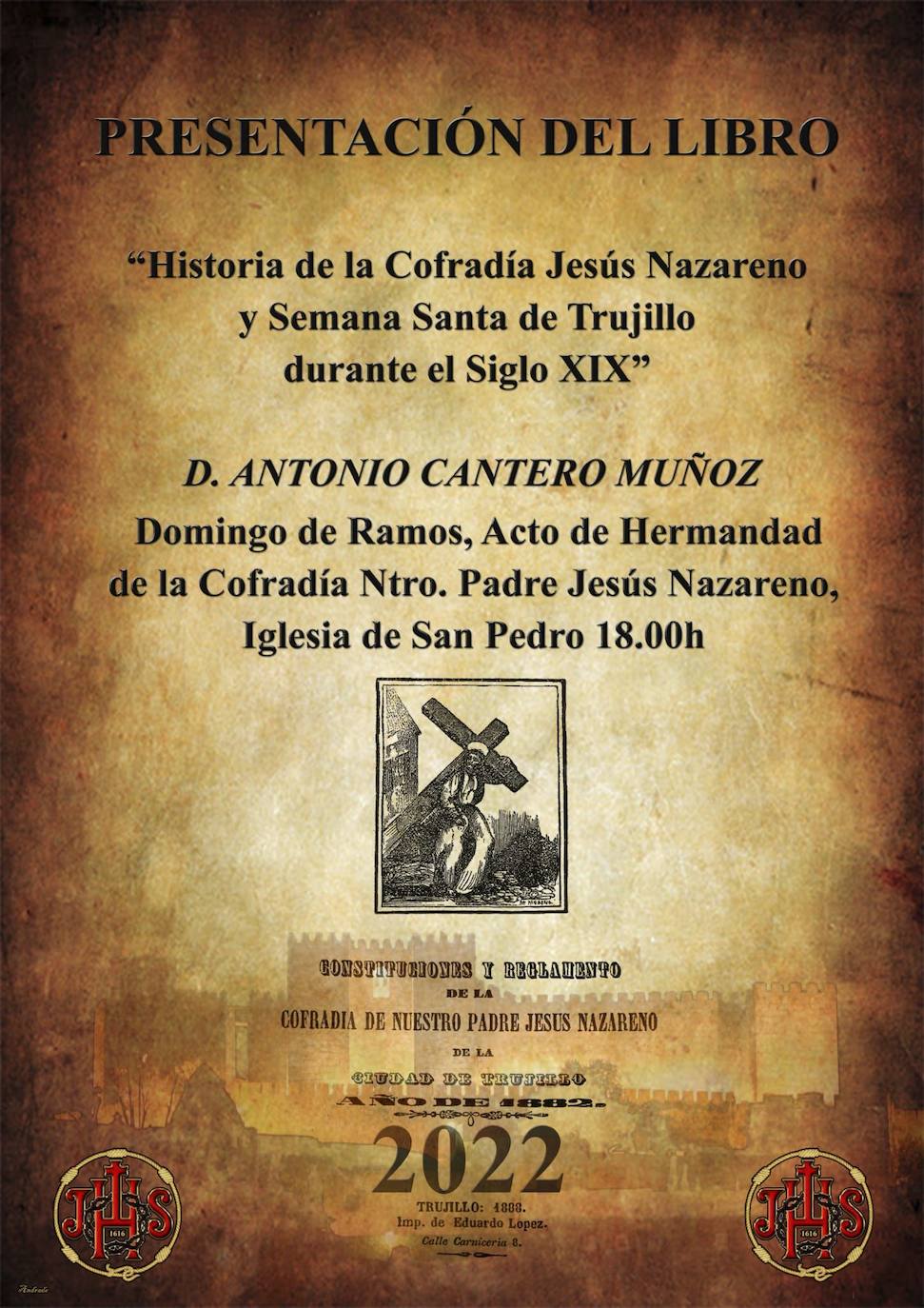 Se trata de un trabajo realizado por Antonio Cantero, que se dará a conocer en el acto de hermandad de la agrupaciónLa Cofradía Nuestro Jesús Nazareno contará hoy con un día intenso. Su principal novedad es la presentación del libro 'Historia de la Cofradía Jesús Nazareno y Semana Santa de Trujillo durante el siglo XIX', escrito por el investigador Antonio Cantero. Tendrá lugar durante el habitual acto de hermandad que lleva a cabo esta agrupación, en el convento de San Pedro, a las seis de la tarde.