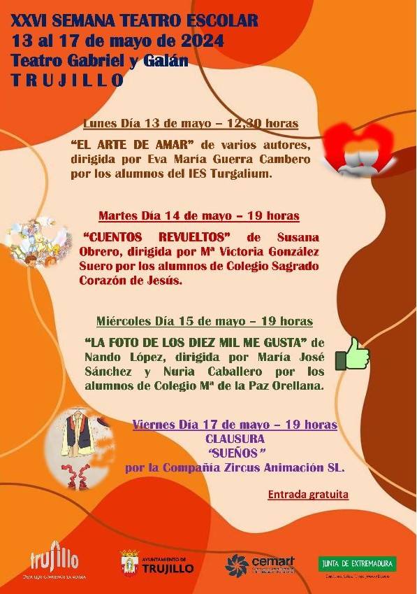 Al día siguiente será el turno del Colegio Sagrado Corazón, que pondrá en escena 'Cuentos revueltos' de Susana Obrero. Está dirigida por María Victoria González. Será a las 19.00 horas. El tercer centro participante será el colegio María de la Paz Orellana, con la obra 'La foto de los diez mil me gusta' de Nando López. Está dirigida por las docentes María José Sánchez y Nuria Caballero. Esta función tendrá lugar el 15 de mayo, también a las 19.00 horas.