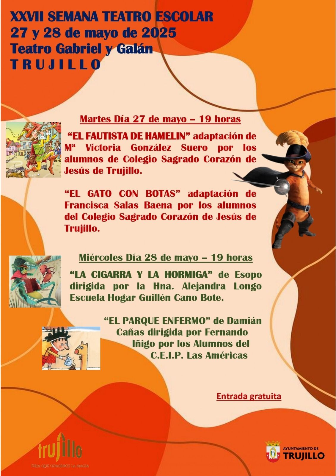 Estas jornadas dedicadas a las artes escénicas serán inauguradas por el alumnado del colegio Sagrado Corazón de Jesús. Este primer día pondrán en escena 'El Flautista de Hamelín', con una adaptación realizada por María Victoria González. Los estudiantes de este colegio también interpretarán una adaptación de 'El Gato con Botas', realizada por Francisca Salas.