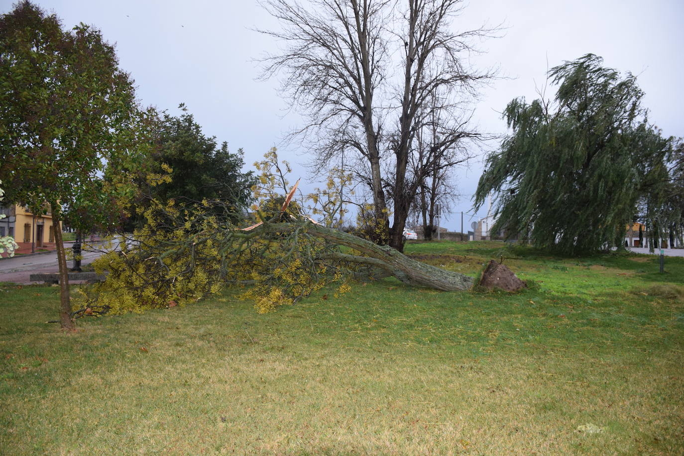 Este temporal, asimismo, ha dejado otros daños materiales. Prueba de ello es que la propietaria de un coche puso la denuncia ante la Guardia Civil por la rotura de la luna trasera producida por una teja. Fue avisada por la Policía Local. También se produjeron caída de antenas, además de árboles al final de la avenida de Miajadas, en la avenida Ramón y Cajal y en la zona del Palomarejo. Junto a la Guardería Bambi, se cayó una farola, entre otros incidentes.