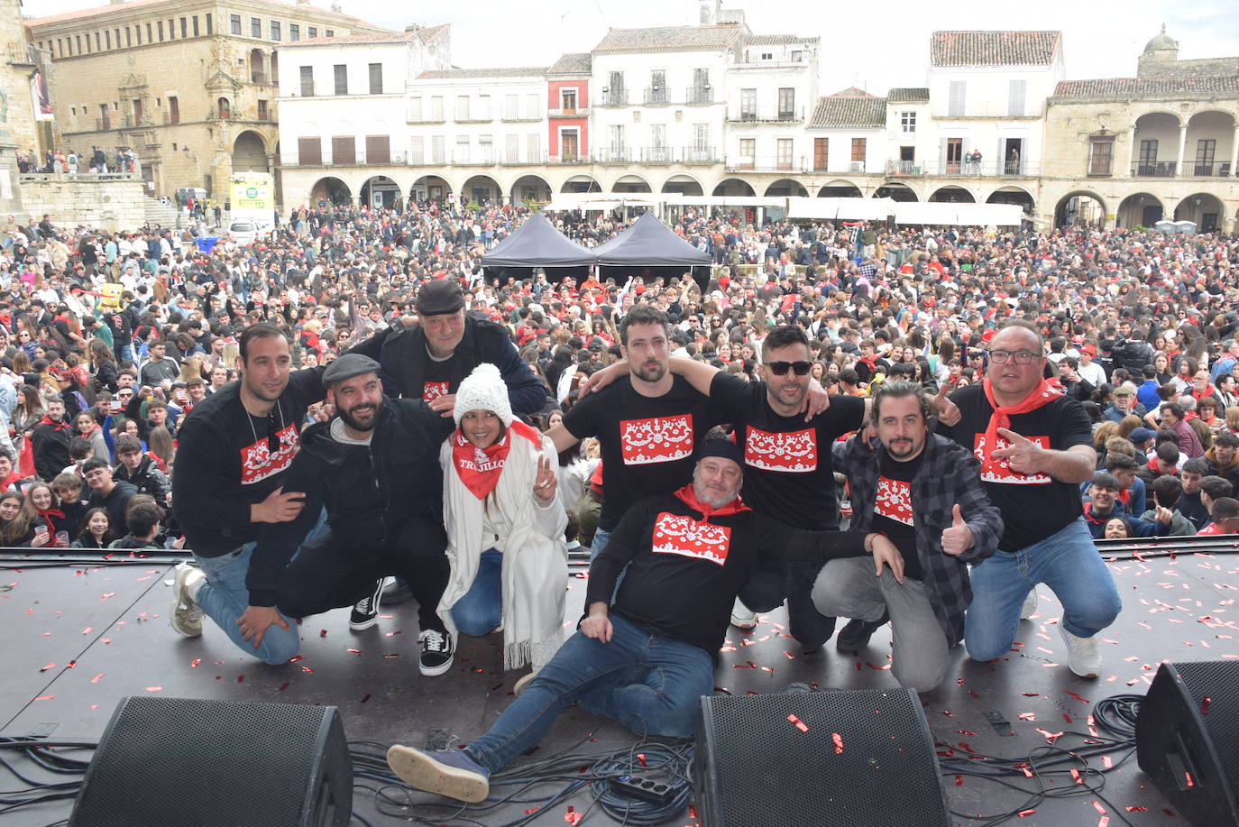 La cita es obligada, haga frío o calor, con lluvia o sin ella. En esta ocasión, no podía ser menos. Se trató de la celebración este domingo del Chíviri, en la plaza Mayor trujillana, una fecha siempre esperada y que muchos vecinos y vecinas tienen marcada en rojo. Aunque la amenaza de lluvia fue constante, al final, el tiempo se alió con el ambiente festivo y permitió que cientos de personas disfrutasen de este día, al menos, en sus horas centrales. También es cierto que se notó menos participantes que en otras ediciones, quizá, por esas previsiones de lluvia.