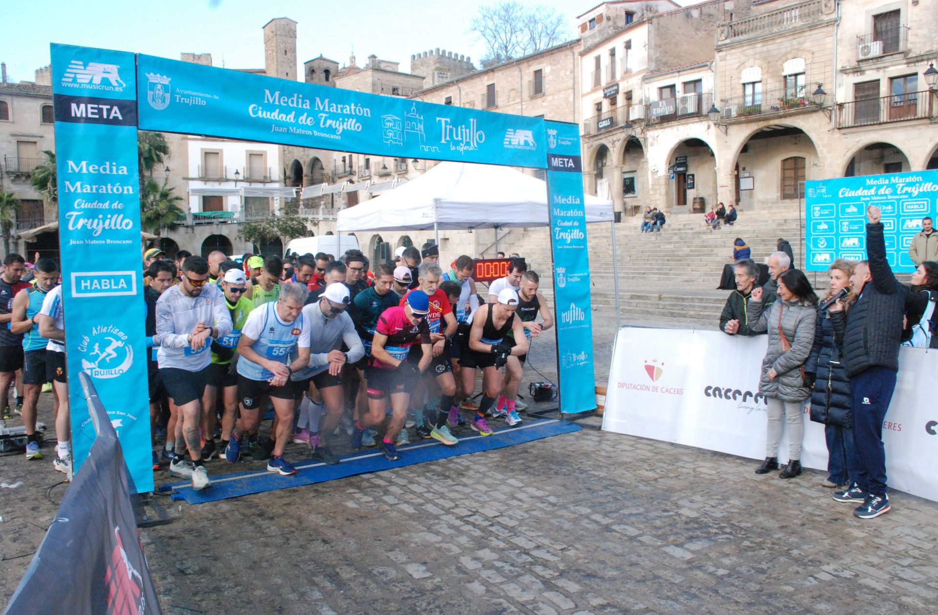Un total de 127 corredores desafiaron ayer al frío con su participación en la Media Maratón Ciudad de Trujillo 'Juan Mateos Broncano', con salida y llegada en la plaza Mayor. No obstante, gran parte del recorrido fue por algunos caminos y, principalmente, por la Cañada Real de Puerto de Miravete, por donde los participantes tuvieron que sortear y atravesar zonas encharcadas por la lluvia de los últimos días.